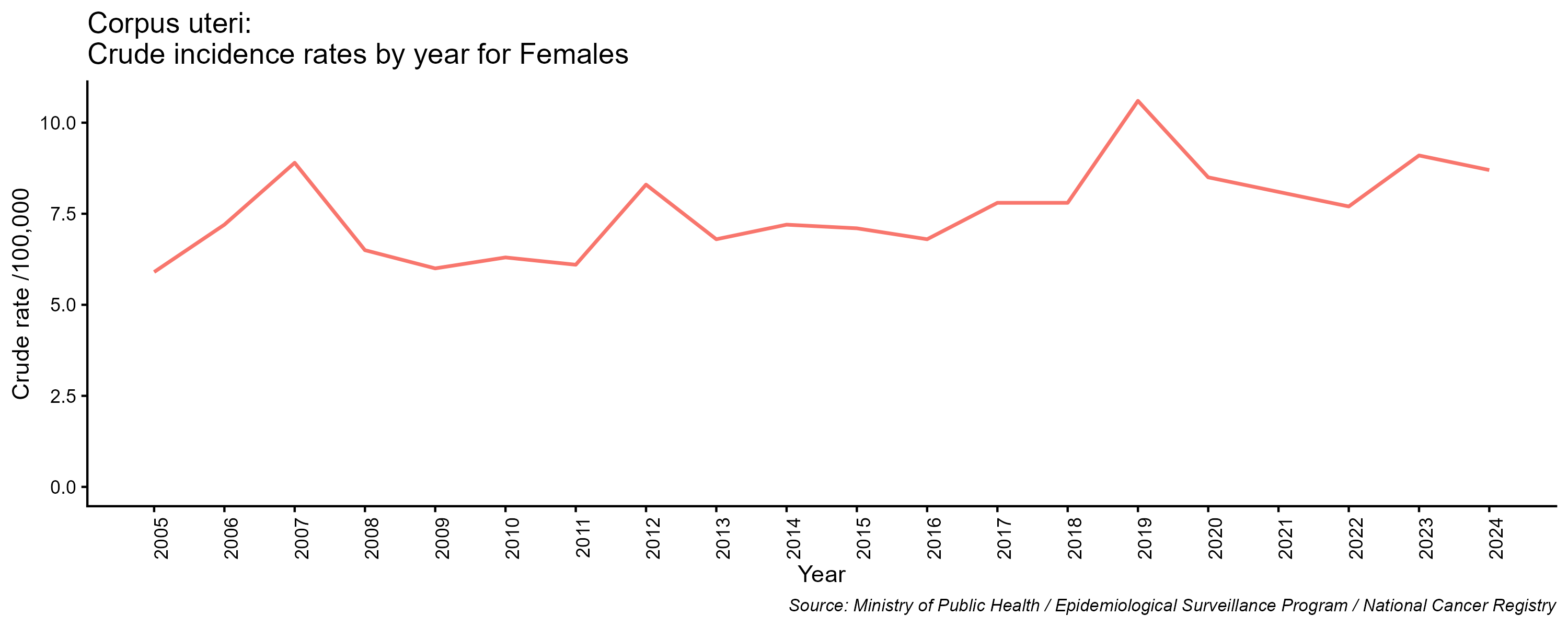 - Col uteri cancer, crude incidence rate, by year, 2005-2024